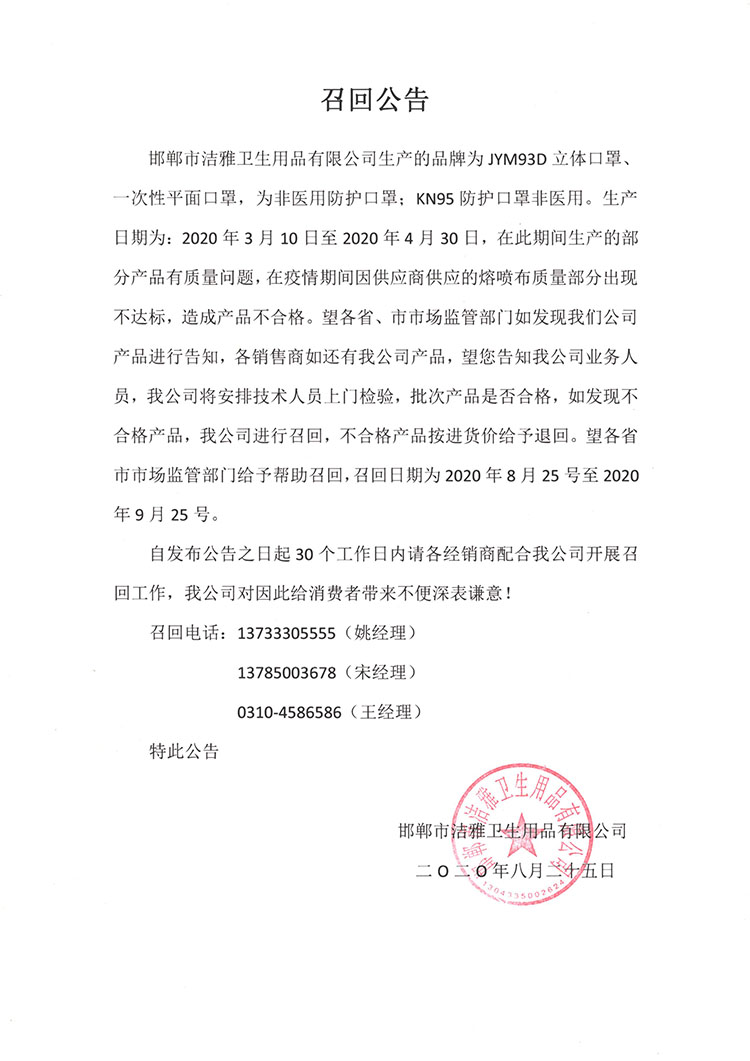 邯鄲市潔雅衛生用品有限公司生產的品牌為JYM93D立體口罩一次性平面口罩,為非醫用防護口罩;KN95 防護口罩非醫用。生產日期為:2020年3月10日至2020年4月30日,在此期間生產的部分產品有質量問題,在疫情期間因供應商供應的熔噴布質量部分出現不達標,造成產品不合格。望各省、市市場監管部門如發現我們公司產品進行告知,各銷售商如還有我公司產品,望您告知我公司業務人員,我公司將安排技術人員上門檢驗,批次產品是否合格,如發現不合格產品,我公司進行召回,不合格產品按進貨價給予退回。望各省市市場監管部門給予幫助召回召回日期為2020年8月25號至2020年9月25號